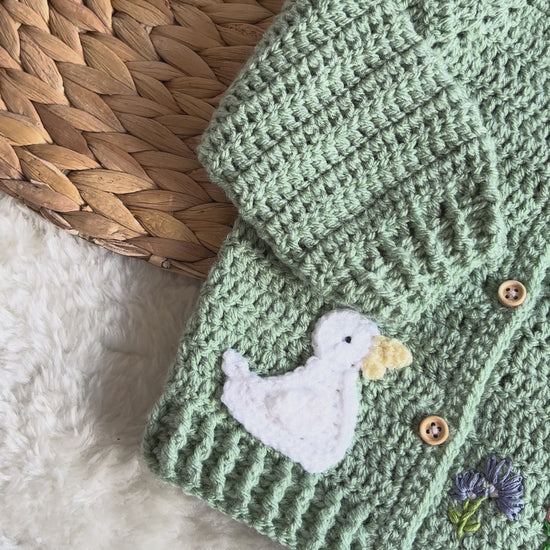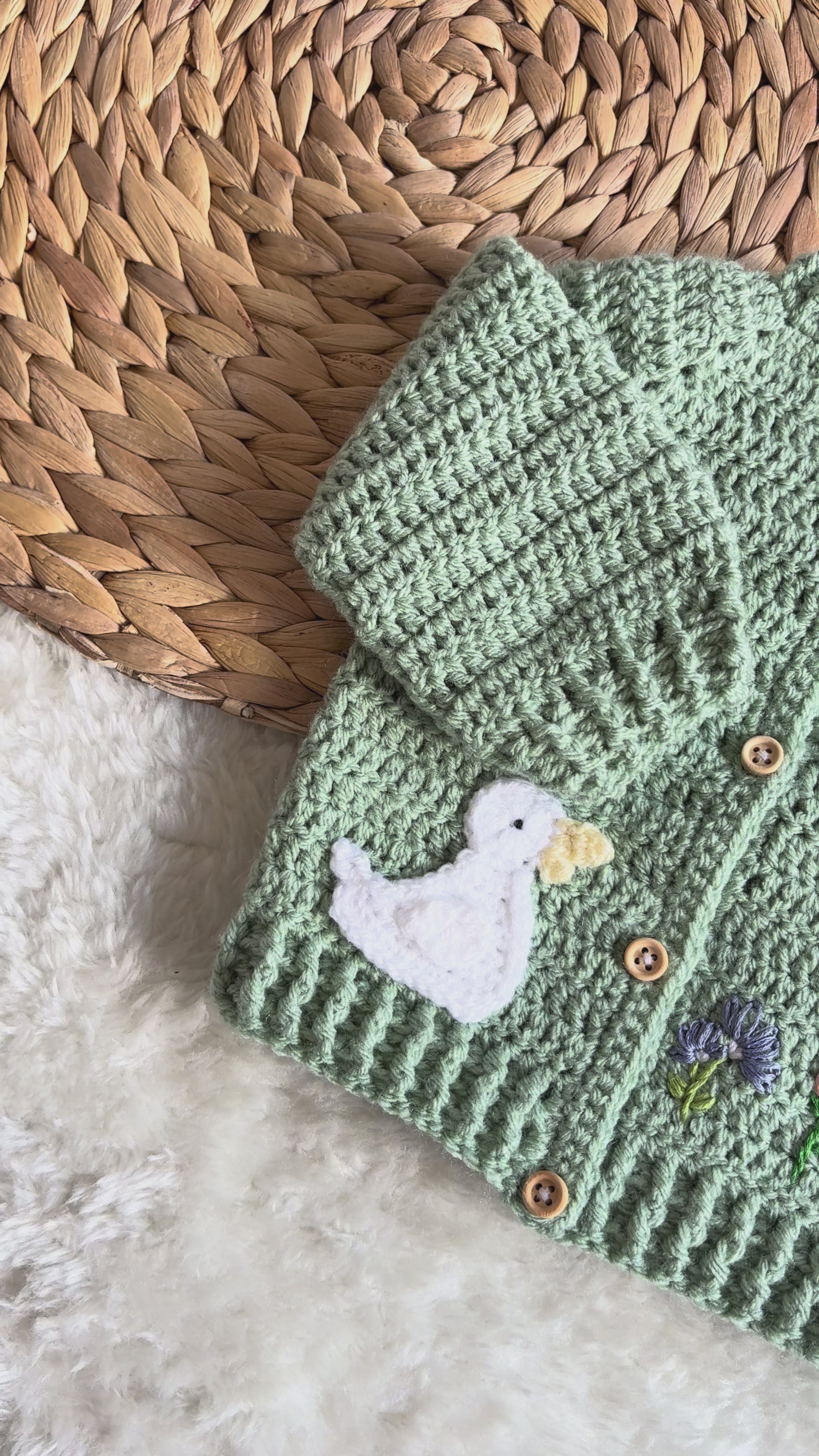 Handmade Crochet Duck and Wildflowers Embroidered Sage Green Cardigan